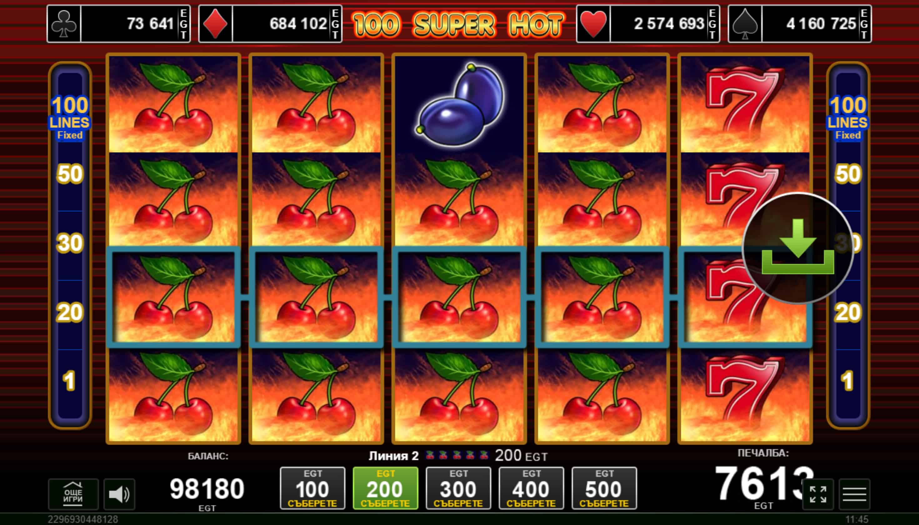 100 Super Hot es una tragamonedas diseñada por EGT y consta de 100 líneas de combinación ganadora, 5 carretes y 4 filas en los que se distribuyen los diferentes símbolos de la máquina.
