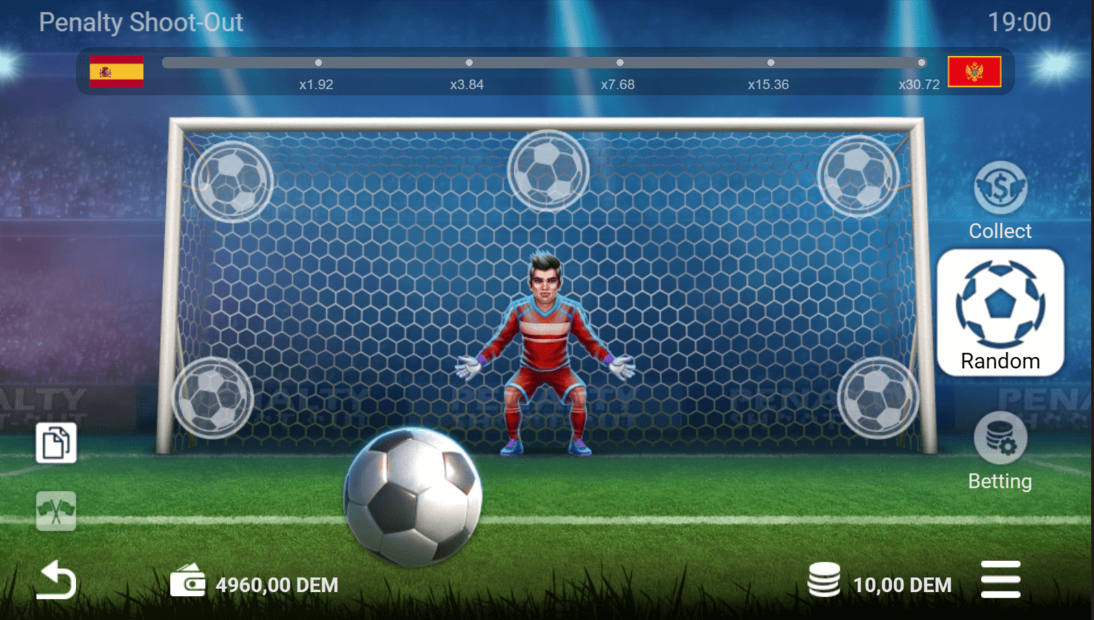 4) El valor de estos multiplicadores es de 1.92, 3.84, 7.68, 15.36 y 30.72x. Si anotas cinco penaltis consecutivos, recibes el premio mayor de 2.304 EUR.