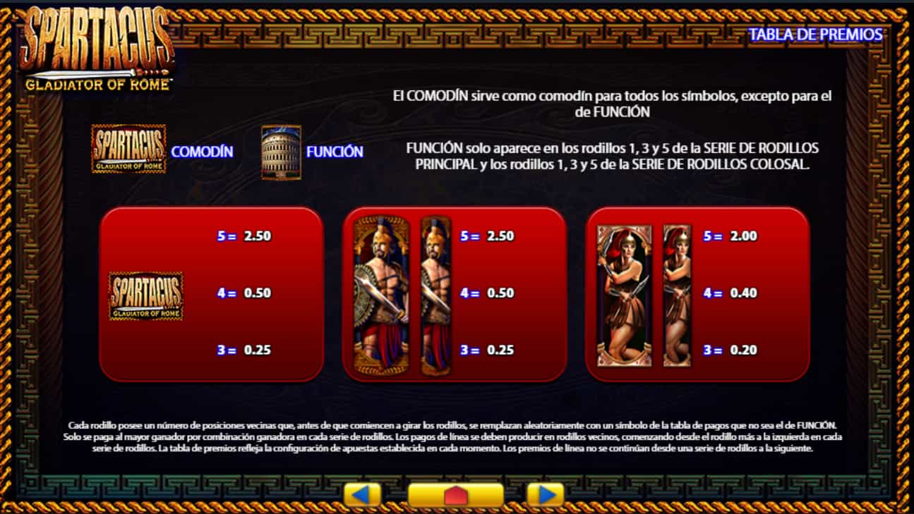 Los símbolos de mayor valor son el símbolo del comodín que es Spartacus el cual te premia 5x veces el valor de lo que estás apostando. También el símbolo de scatter es muy interesante, ya que te premia con giros gratuitos dependiendo de si consigues 3, 4 o 5.