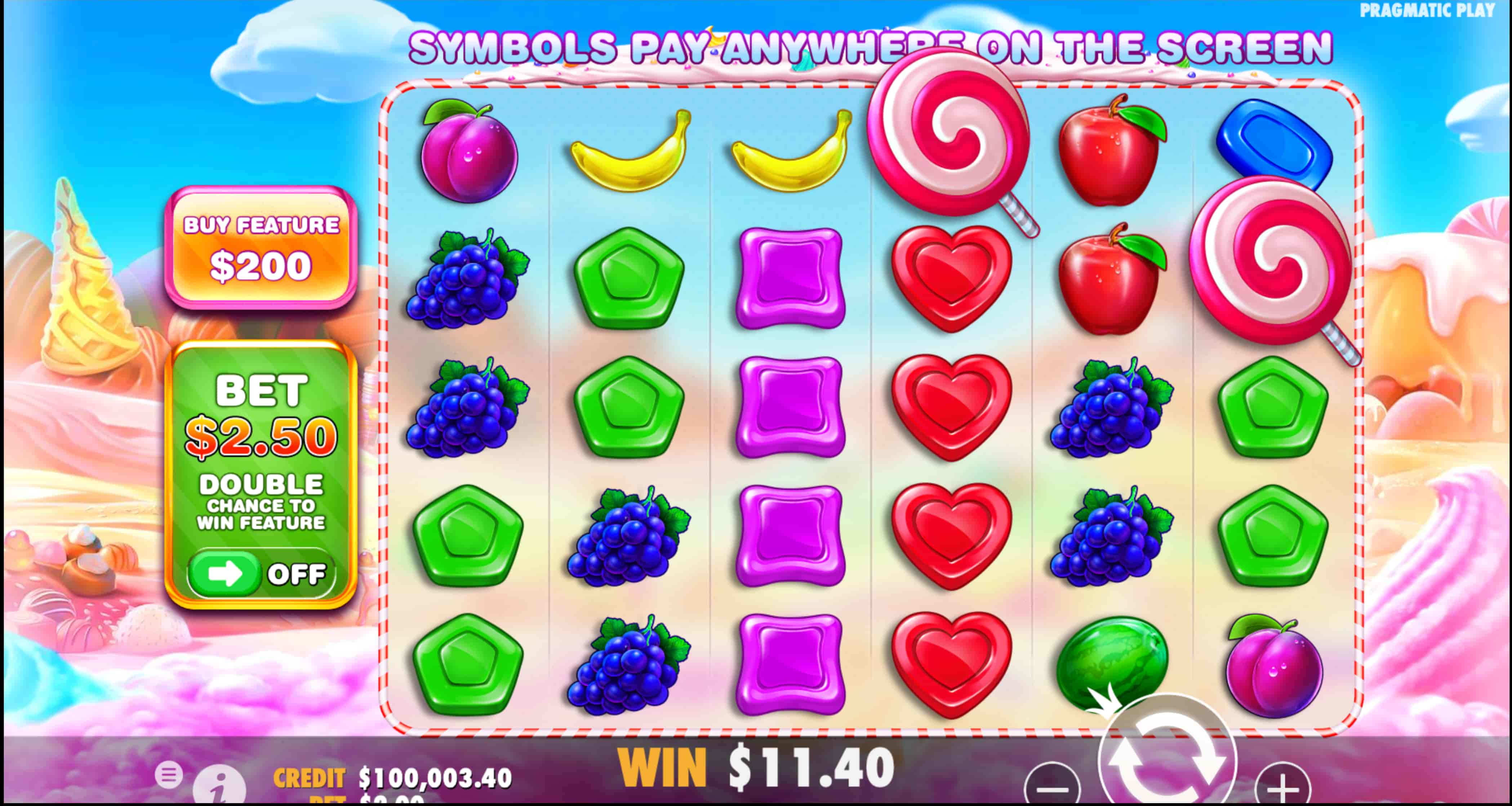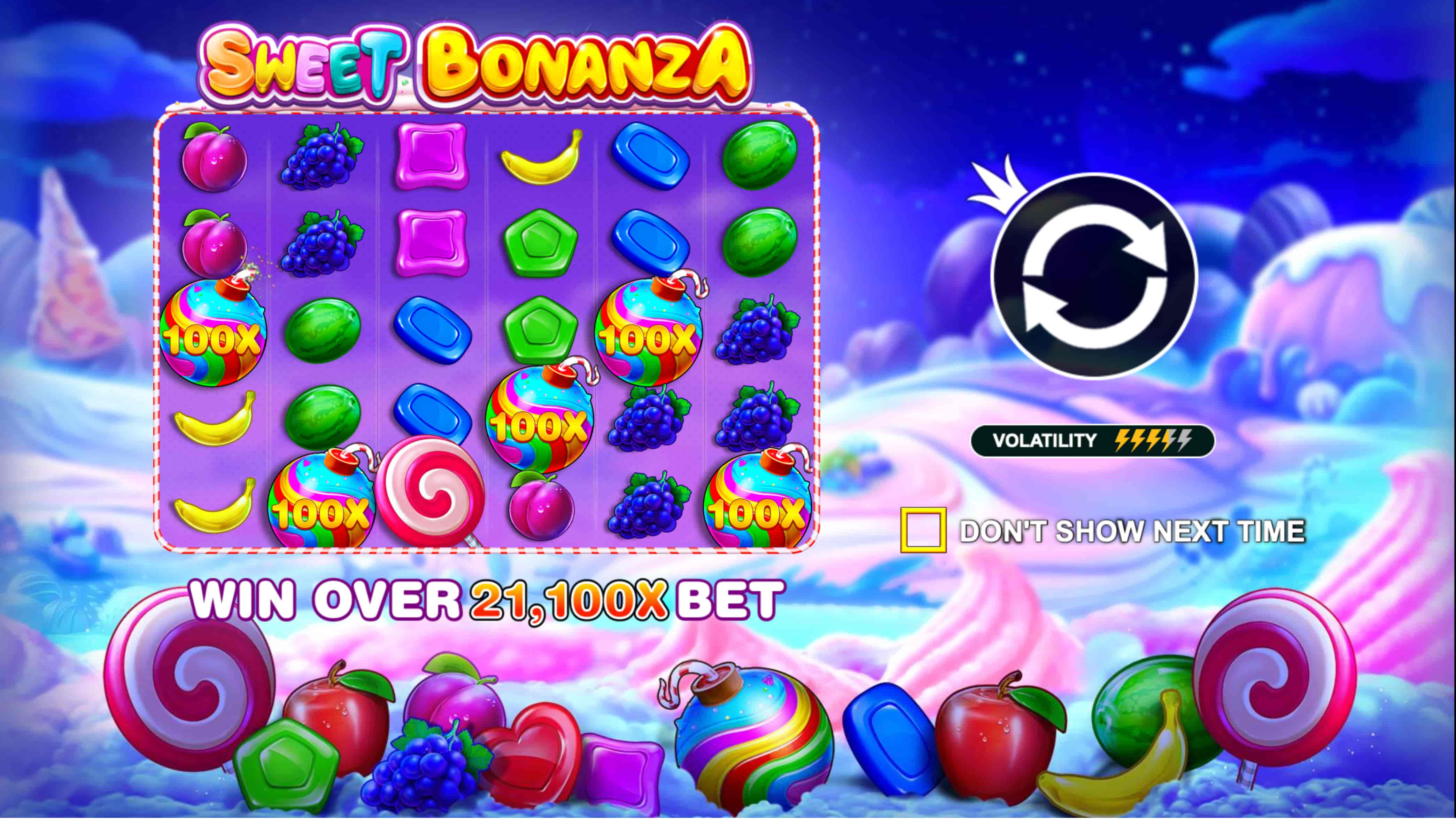 El símbolo multiplicador dentro del juego es la esfera de dulce de colores 100x la cual dependiendo de dónde se ubique en pantalla puede premiar con multiplicador que va desde 2x hasta 100x.