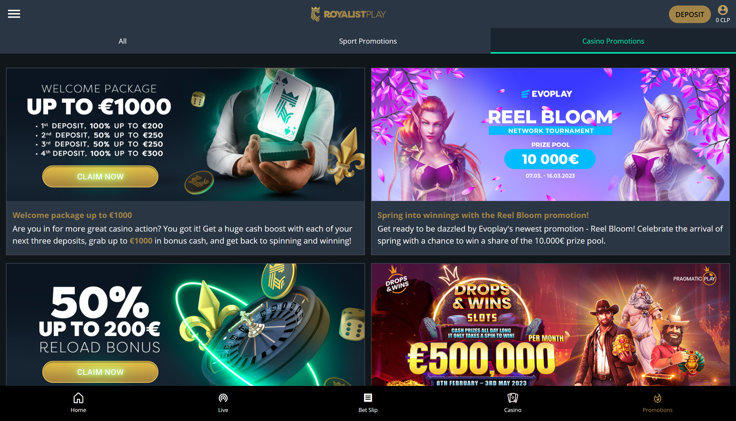Los bonos de casino y promociones de Royalist Play Casino están disponibles en su sesión de promociones, ubicado en la parte superior del sitio web, donde podemos ver diferentes promociones las cuales puedes solicitar si estás registrado y cumples con algunas de sus políticas.