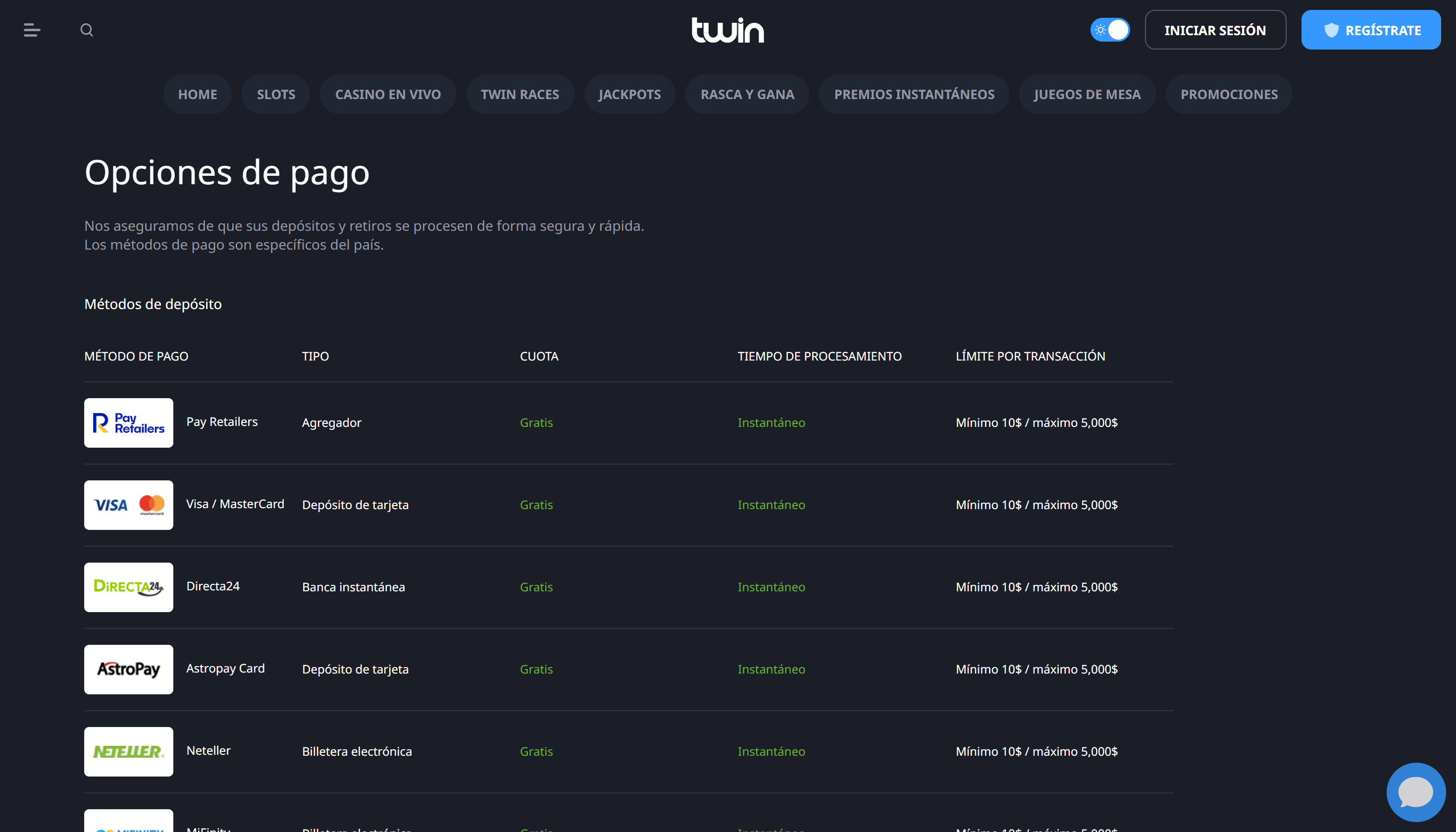 Twin online casino ofrece la seguridad necesaria para proporcionar pagos y retiros confiables para todas las personas. Una de las mayores desventajas es que el casino no ofrece medios de pagos locales ni tampoco acepta moneda local. Una consideración importante es que los pagos aparecen en dólares.